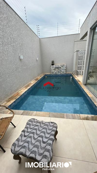Piso Inferior: Sala, cozinha, área gourmet, lavanderia, banheiro, piscina aquecida e garagem para dois carros lado a lado.
