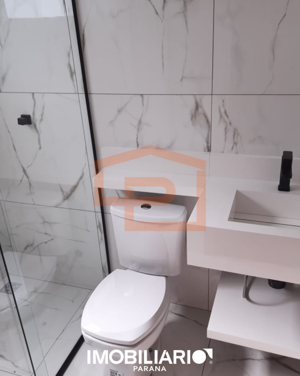 Os banheiros com pia esculpida em porcelanato e box em blindex